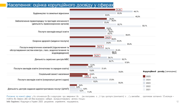 Найбільш значуще корупційний досвід населення знизився у сфері будівництва та земельних відносин: у 2024 році з корупцією стикалися 44,1% з тих, хто контактував з цією сферою, а у 2025-му – 31,8%. Однак, попри позитивну динаміку, цю сферу оцінюють як найбільш корумповану вже другий рік поспіль.