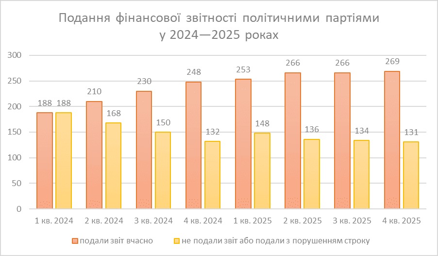 Позитивна динаміка збереглася й у 2025 році. У І кварталі 2025 року звітність подали 253 політичні партії, у ІІ кварталі — 265, а у ІІІ кварталі — 266. У IV кварталі 2025 року показник зріс до 269 політичних партій, які подали звіти у встановлений законодавством строк.