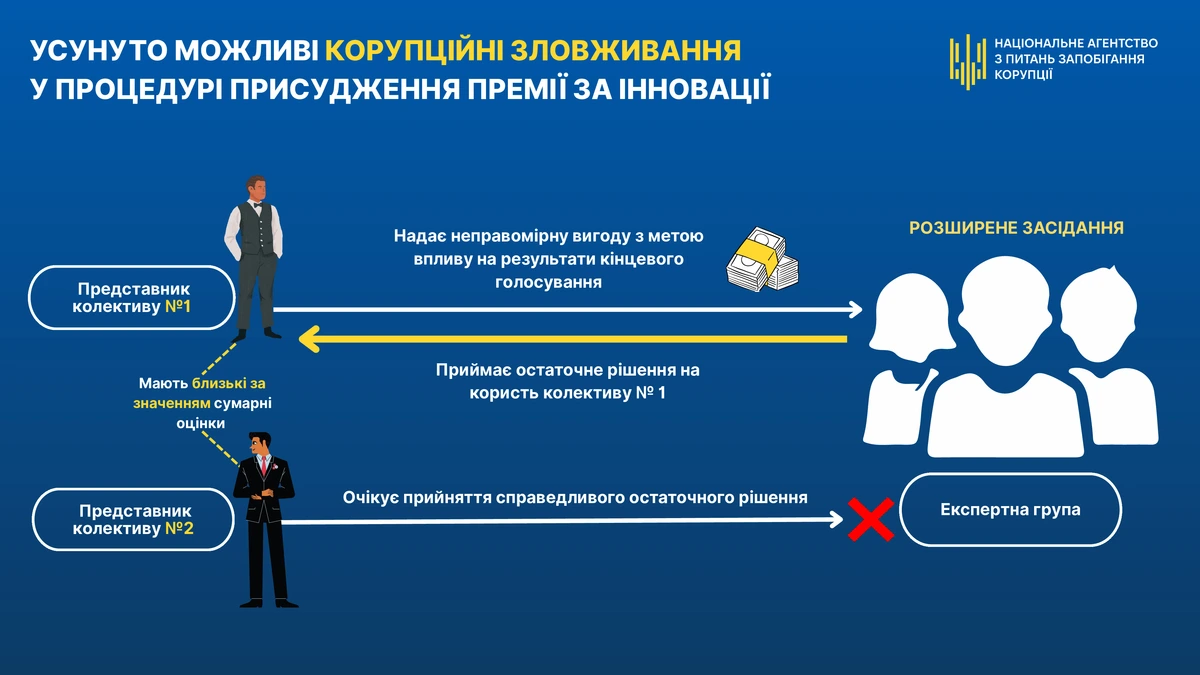 Так, відповідно до проєкту Постанови у випадку наявності рівних або близьких за значенням сумарних оцінок остаточне рішення приймається на розширеному засіданні Експертної групи, до участі в якому можуть бути запрошені уповноважені представники номінованих авторських колективів. Вказане створює умови для надання неправомірної вигоди завдяки можливості особистого контакту представника номінованого авторського колективу з членами Експертної групи.