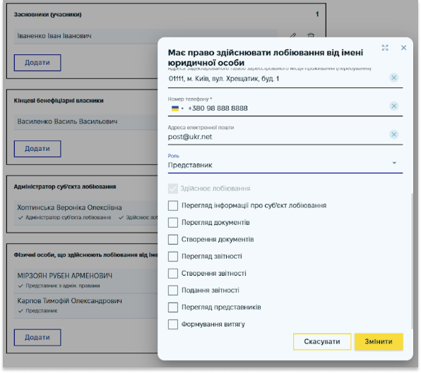 Також функціонал актуалізації передбачає можливість змінити повноваження представників юридичної особи – суб’єкта лобіювання та відомості про них. Для цього необхідно в меню актуалізації відомостей перейти до редагування блоку «Фізичні особи, що здійснюють лобіювання від імені юридичної особи» та обрати або прибрати відповідні позначки. Детальніше про ролі та повноваження представників можна дізнатись в Інструкції з реєстрації суб’єкта лобіювання.