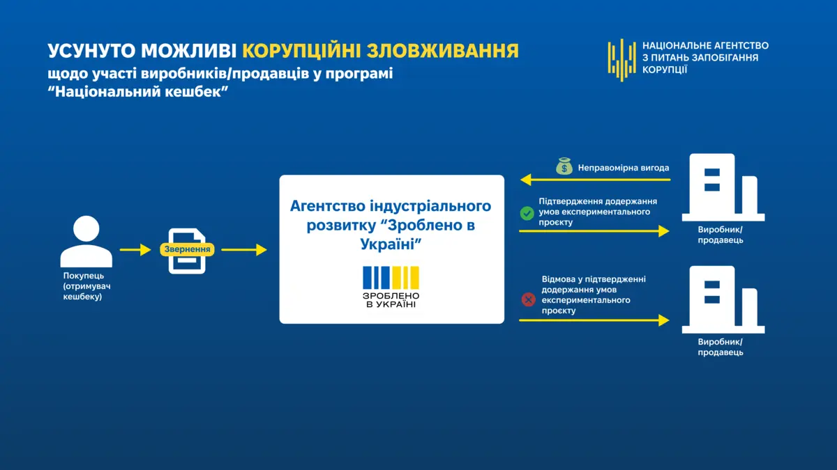 У своєму висновку НАЗК надало рекомендацію, щоб усунути можливість АТ «Агентство індустріального розвитку «Зроблено в Україні» приймати суб’єктивні та упереджені рішення з метою блокування участі окремих виробників і продавців у експериментальному проєкті. Міністерство економіки, довкілля та сільського господарства України, яке є розробником документу, врахувало цю рекомендацію і виключило положення, що могло сприяти корупційним зловживанням.